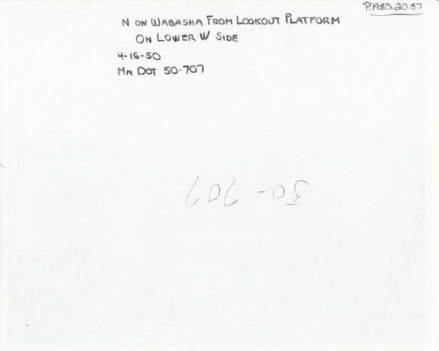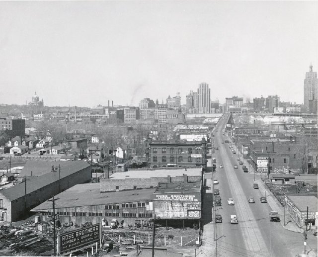 | Description | Black and white photograph of downtown St. Paul on Wabasha Street from the lower west side. Some of the featured businesses (from left to right) include the St. Paul Cathedral, the NSP Building at 76 West Kellogg Boulevard, Central Library, West Publishing at 50 West Kellogg Boulevard, Booth Cold Storage at 40 West Kellogg Boulevard, Rose Bros. at 187-197 South Wabasha Street, St. Paul Corrugating Co. at 3-23 West Water Street, State Capitol, the Minnesota Building at Fourth and Cedar Streets, Cherry-Burrell Corp. at 1933 East Fairfield, and the 1st National Bank. |